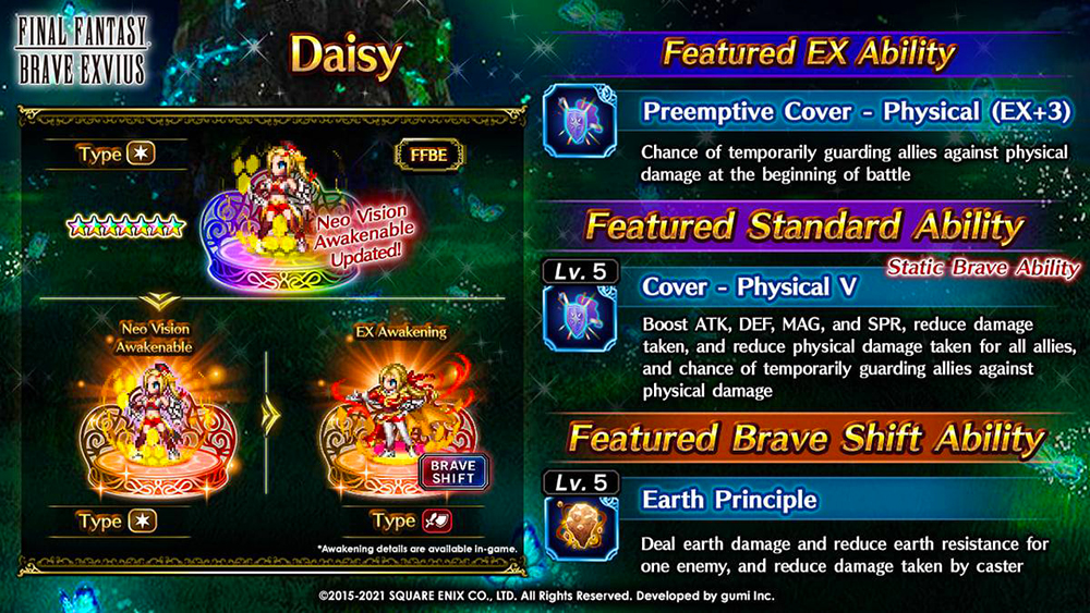 Daisy features two awakenable abilities, this includes Cover-Physical and A Crush on Rain. Cover Physical increases all allies’ statistics by 230 percent for four turns. It mitigates 50 percent of the damage taken for four turns. It also has a chance to protect all allies from physical damage with damage mitigation for four turns.
