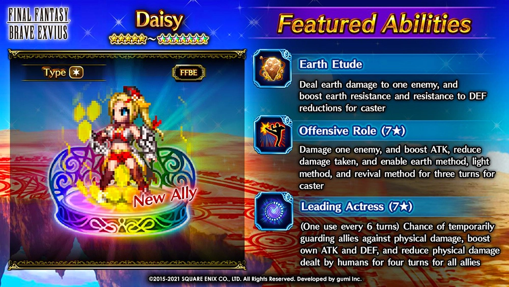 Unlike the other abilities, Daisy features one limit burst ability called Actress of the Arena, although, it depends on the rarity and the level of the character. This ability has a chance to protect all allies from 80 percent physical damage. Additionally, it features damage mitigation for five turns to the caster. However, it also increases earth and light resistance by 71 percent for five turns to all allies.