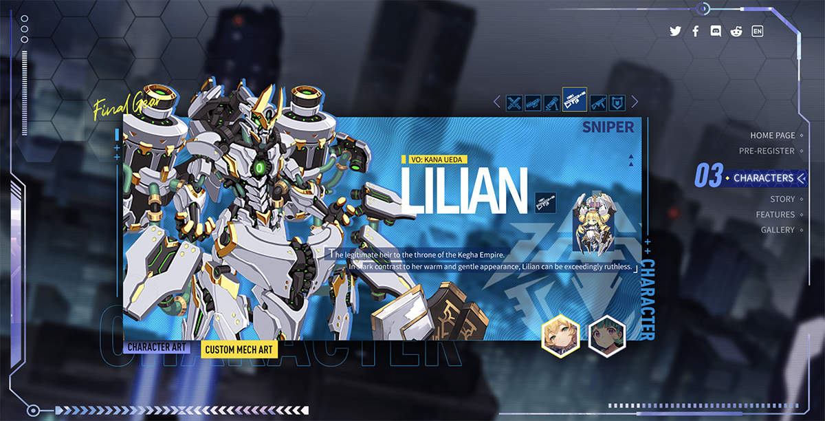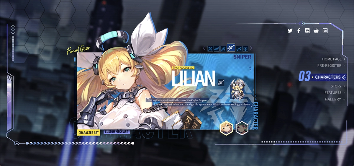 One of the pilots players can obtain in Final Gear is Lilian. It is believed that she is the legitimate heir to the throne of the Kegha Empire. In stark contrast to her warm and gentle appearance, Lilian can be exceedingly ruthless. Lilian takes on the role of a sniper on the battleground.