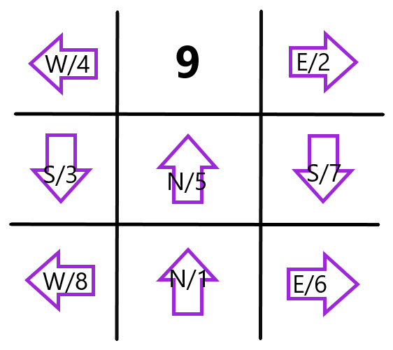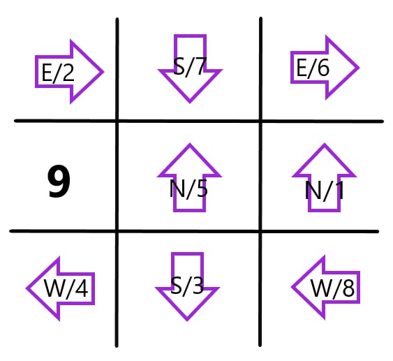 One shall be North, East shall be two, South three and West four. Adding on another four for those cubes with floating stone slates on them, gives us five through eight.”