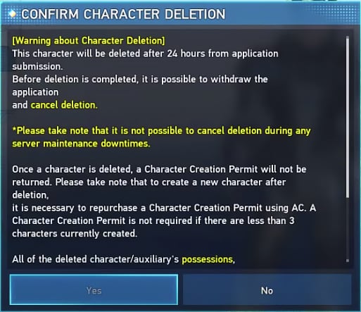 However, it is not possible to cancel character deletion during server maintenance downtime, so you should plan your character deletion accordingly.